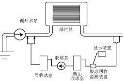 目前,大多數(shù)電廠對(duì)凝汽器的結(jié)垢主要是采用周期性膠球清洗的辦法進(jìn)行處理,即膠球清洗。凝汽器周期性膠球清洗裝置是由收球網(wǎng)、膠球輸送泵、裝球室、控制器、膠球及閥門(mén)管路等部件組成的(如圖1所示)。它借助高壓水流的作用將大于凝汽器冷卻管內(nèi)徑的清潔膠球擠過(guò)冷卻水管,對(duì)冷卻水管進(jìn)行反復(fù)擦洗,清洗凝汽器冷卻水管內(nèi)污垢并帶出雜質(zhì)。