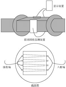 裝置采用對(duì)照式光纖傳感器,無(wú)膠球通過(guò)時(shí),光纖傳感器的入射端發(fā)出的光線能夠被接收端接收,如果有膠球通過(guò),光線被遮擋,接收端接收不到光線信號(hào),即發(fā)出1個(gè)脈沖信號(hào),該脈沖波信號(hào)傳輸?shù)斤@示裝置增加檢測(cè)膠球數(shù),如圖2所示。