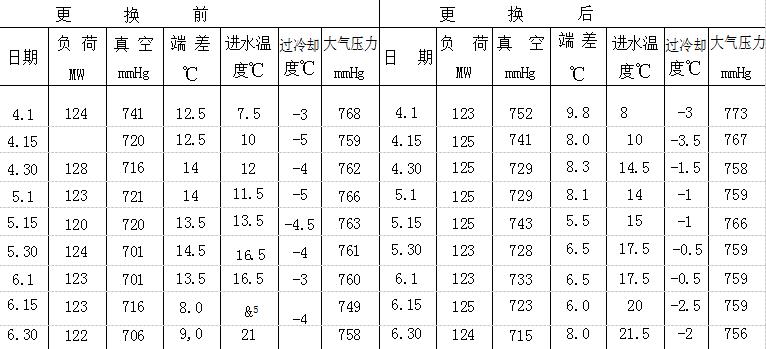 2、每臺(tái)機(jī)每?jī)商爝M(jìn)行一次膠球清洗,每次投入300個(gè)膠球,清洗1小時(shí),收球半小時(shí)。經(jīng)過兩年的實(shí)踐,證明14FH-5-0凈水器和S-14-0收球網(wǎng)操作方便、除污性強(qiáng)、耐海水腐蝕、收球率在95%以上、對(duì)凝汽器冷卻管保護(hù)膜沒有損壞、減輕了檢修人員的勞動(dòng)。凝汽器各項(xiàng)經(jīng)濟(jì)指標(biāo)大有好轉(zhuǎn),經(jīng)濟(jì)效益顯著提高。以1號(hào)機(jī)為例,更換前、后每月抽出三天,以每天上午9點(diǎn)鐘的運(yùn)行參數(shù)進(jìn)行同期比較,見附表.