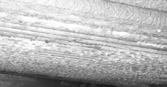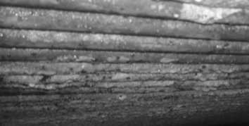 2)末效鈦管內(nèi)有薄薄的一層水垢沉積物,并有黏泥雜質(zhì)形成的沉積物,以及藻類、貝類等雜物,垢樣分析主要成分為碳酸鈣,見圖2。