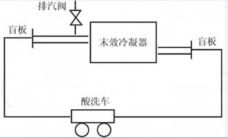 末效的清洗先用高壓水槍沖洗黏泥以及藻類、貝類等雜物,再采用酸洗,以除去碳酸鈣垢,清洗劑選用鹽酸。末效冷凝器將蒸發(fā)器末效進(jìn)出口1m彎頭拆掉,在法蘭處增加盲板,在盲板上連接DN100管道,管道與酸洗車進(jìn)出口進(jìn)行連接,構(gòu)成循環(huán)酸洗回路,見圖8。