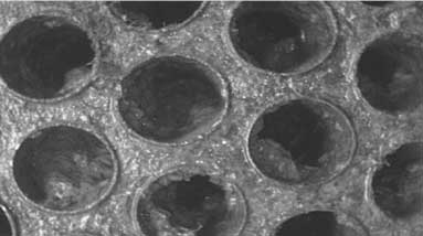 凝汽器膠球清洗裝置中前7效清洗時(shí),首先采用酸洗,以除去硫酸鈣以外的大部分水垢,考慮到銅鋁合金管壁較薄,且垢層厚薄不均勻,需要選擇腐蝕性小,又有較好的清洗效果的酸性清洗劑,所以酸洗清洗劑選擇氨基磺酸。其后采用中性清洗劑進(jìn)行螯合清洗,該清洗劑主要包含螯合劑、表面活性劑、聚合物,對(duì)垢表面潤濕、滲透,改變垢晶體結(jié)構(gòu),使垢膨化疏松,便于通過水流攜帶出系統(tǒng)。前7效采用蒸發(fā)器自身的循環(huán)系統(tǒng)進(jìn)行清洗。首先在循環(huán)清洗液中加入銅緩蝕劑,由于銅緩蝕劑呈堿性,所以循環(huán)清洗液呈堿性。隨后不斷地向系統(tǒng)中注入淡化水,以增大循環(huán)水量,由于淡化水呈弱酸性,所以循環(huán)清洗液pH值逐漸降低,直至接近淡化水的pH值(約6左右)。此時(shí)階段循環(huán)清洗液中的總硬較平穩(wěn),在200mg/L左右。第230min時(shí),開始向系統(tǒng)中注入710清洗劑,由于710清洗劑是一種復(fù)合型有機(jī)酸類清洗劑,清洗機(jī)理主要是通過與無機(jī)鹽、金屬氧化物等形成螯合物。故在加入710后,其首先與清洗液中的鈣離子反應(yīng),使清洗液中的鈣離子逐漸降低,直至為零。第320min時(shí),開始向系統(tǒng)中注入氨基磺酸,pH值迅速下降,第375min時(shí),降低至1.5,停止注酸。隨著氨基磺酸的注入,碳酸鈣垢開始分解,清洗液中的Ca2+濃度迅速增大,由于碳酸鈣垢分解消耗了大量的酸,pH值也迅速上升。第400min時(shí),清洗液中的總硬達(dá)到1150mg/L,pH值上升至4.5,并再次向系統(tǒng)中注入氨基磺酸。隨著酸的注入,pH值再次迅速下降,總硬繼續(xù)上升。第415min時(shí),pH值下降至1.5,停止注酸。第435min時(shí),總硬1450mg/L,pH值略上升至1.7,此后,總硬、pH值相對(duì)平穩(wěn),說明清洗終點(diǎn)到達(dá),停止酸洗。酸洗前后的結(jié)垢情況,見圖4、圖5。