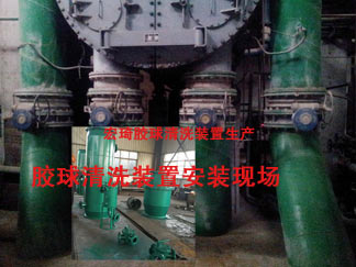 膠球的直徑比冷卻管內(nèi)徑略小一點(約1-2mm),膠球在冷卻管內(nèi)靠水流和自身的彈性跳動,在跳動沖刷過程中除去吸附在冷卻管內(nèi)壁的污垢。
